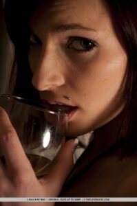 Era una noche agradable y Leila supuestamente estaba fuera para una cita para la cena, pero estaba de pie. En lugar de sentirse triste y arruinando su noche, abrió una botella de 2005 Mount Riley Chardonnay y se vertió una bebida. Después de algunos vidrio, nuestra mademoiselle de cabello carmesí ya está borracho. Una cosa que debes sobre Leila es que ella también se vuelve traviesa y atrevida cuando está borracha. Ella comienza a quitarse el vestido negro, revelando sus pechos pequeños pero alegre. Luego comienza a tocar su trasero redondo y mostrando sus medias negras hasta el muslo.
