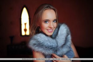 Vestida con un abrigo de piel gris claro, un collar de cuentas largas y medias blancas hasta el muslo, Rachel parece un JetSetter ultra de moda mientras se posa contra un lujoso entorno temático de Morrocan. El rico tono carmesí marrón y profundo crea el fondo perfecto para este aturdidor de ojos azules. Con una gran sonrisa, se desnuda cada parte de su ropa y comienza a hacer alarde de sus pezones hinchados y cremosa para la cámara de Arkisi.