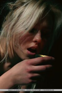 La joven y fresca modelo Samanta debuta en su primera serie en The Life Erotic. Ella usa una camisola de encaje transparente y transparente que complementa su piel lisa y clara. Las torles de color iluminado la rodean mientras se tumbaba en una tela diafenosa blanca. En medio de las sombras, acaricia su cuerpo suave y nubil, enfocándose en sus zonas erógenas.