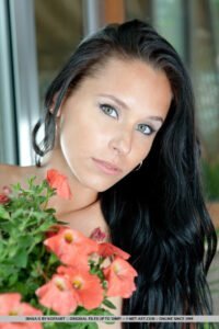 Diana lleva un santo blanco crujiente que muestra sus hombros sexys y una falda maxu de color coral. Se ve fresca y juvenil, con su largo cabello negro en cascada y sus brillantes ojos azules que reflejan la luz de la mañana. Levanta el dobladillo de su falda, dándonos una vista previa de sus largas piernas y esbeltas. Después de quitarle la parte superior, muestra sus exquisitas labios rosados y su trasero tonificado con poses abiertas, extendiendo sus extremidades flexibles.