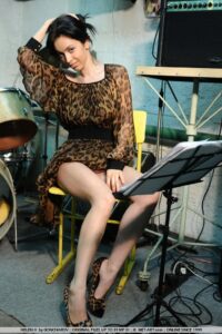 Helen es una bomba de cabello cuervo mientras se quita los jeans con top y cuero impreso de animales antes de tocarse en la guitarra eléctrica y tocar la batería.