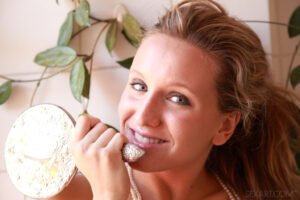 Whiteney se sienta cómodamente junto a la ventana, vistiendo nada más que cuerdas de perlas que adornan su cuello, y las cadenas de cuentas que abrazan su cintura sexy. Ella mira sobre la puerta principal como si esperara a alguien. ¿Un amante quizás? Parece muy emocionada de preparar su coño, abofetear un poco de crema de afeitar y masajearla suavemente antes de permitir que la maquinilla de afeitar pase sobre sus labios de coño rosados. Después de terminar, ella muestra su sonrisa más dulce y encantadora hacia la cámara.