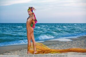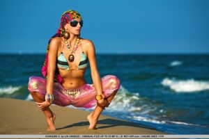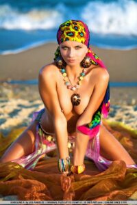 Usando coloridos bufanda de cabeza, bikini, brazalete grueso, aretes y collar, karoline saunters y frolics en la arena de la playa como un encantador gitano marino.