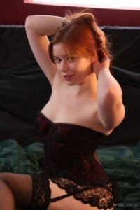 Físico impecable y nubil con proporciones excepcionales de agradables oculares, y una cara bonita siempre sonriente que evoca vitalidad juvenil y energía encantadora. Conoce al encantador y travieso pelirrojo llamado Kimberly. Ella está vestida con un corsé negro y rojo que resalta sus hermosas curvas femeninas y una transmisión negra y un ligero que muestra sus caderas curvas y piernas sexys. Su divertido y juguetón encanto hacia la cámara tiene ese efecto hechizante, su mirada magnetizante te hace querer acercarte a ella.